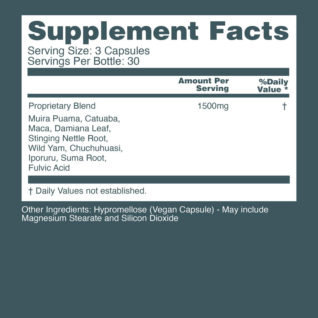 A proprietary blend of Wild Yam Root, Nettle Root, Suma Root, Catuaba, and more.